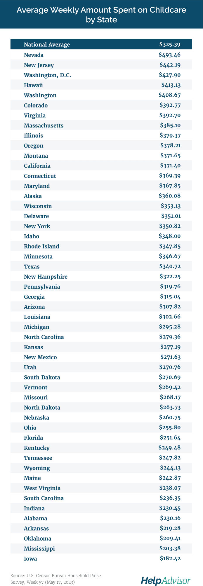 - Weekly childcare expenditures are highest in Nevada ($493.46), New Jersey ($442.19), Washington D.C. ($427.90), Hawaii ($413.19) and Washington ($408.67).